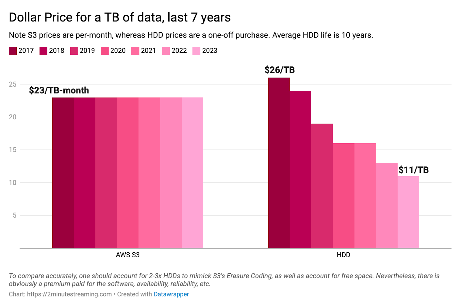- Legacy Economics: While the cost of storage has gone down by 60-70% over the past eight years, Amazon has not reduced their S3 Standard price by $1. Hidden surcharges create unpredictable bills that balloon with scale.