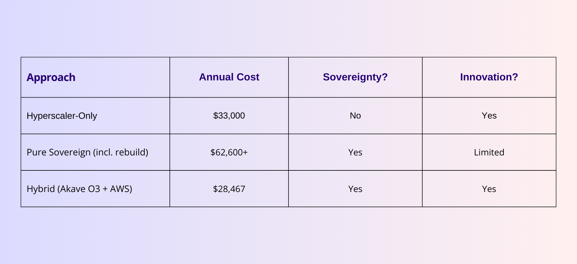 Hybrid costs 14% less than hyperscaler-only. 55% less than pure sovereign. And achieves both objectives.